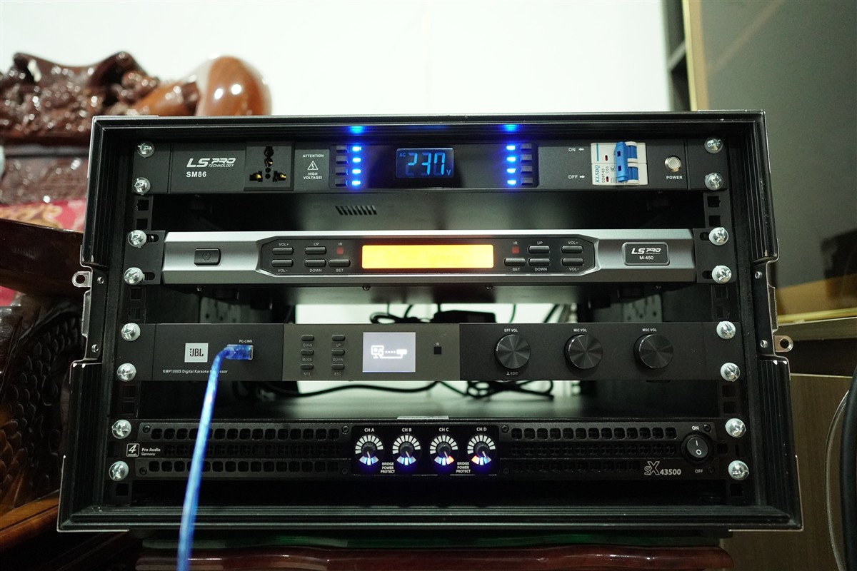 Trong hệ thống karaoke hiện đại, vang số đóng vai trò vô cùng quan trọng. Dự án sử dụng vang số JBL KMP1000S – thiết bị xử lý tín hiệu âm thanh chuyên nghiệp.