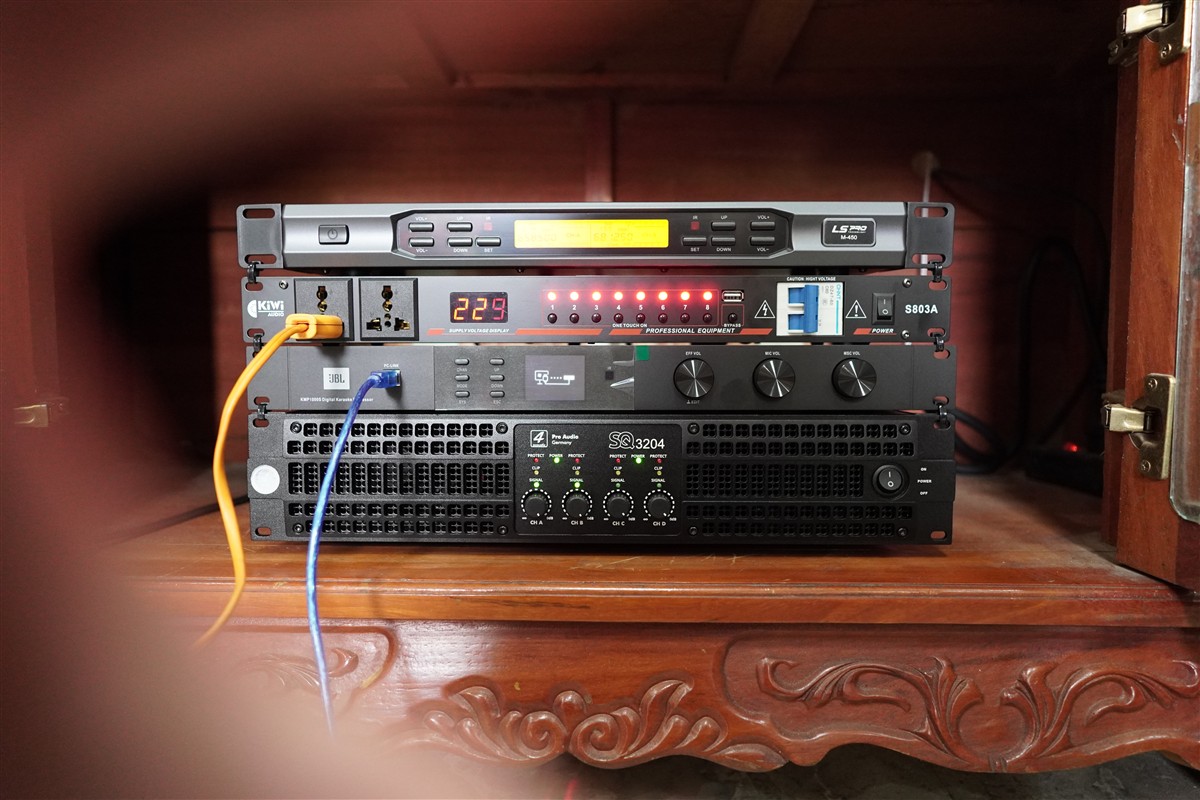 Để dàn karaoke trở nên dễ hát và chuyên nghiệp hơn, SIS ProAV đã sử dụng vang số JBL KMP1000S. Đây là thiết bị xử lý tín hiệu âm thanh giúp điều chỉnh echo, reverb và các hiệu ứng khác cho giọng hát.