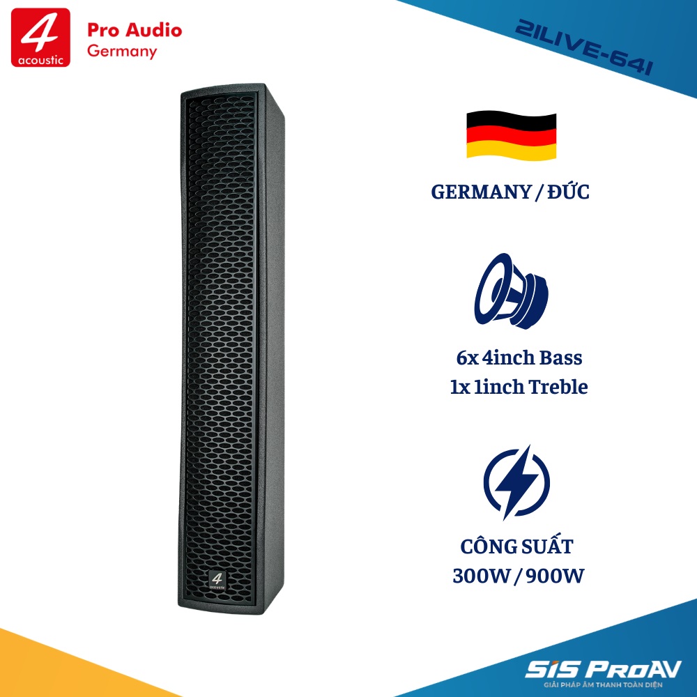 Loa 4Acoustic 21Live 641 là một dòng loa toàn dải (full-range) cao cấp, được thiết kế đặc biệt cho các ứng dụng âm thanh chuyên nghiệp như: hệ thống âm thanh biểu diễn, hội trường, sự kiện, bar, club, và các dự án âm thanh đòi hỏi chất lượng cao. Với cấu trúc loa 2 đường tiếng (2-way) độc đáo, 21Live 641 mang đến một trải nghiệm âm thanh sống động, chi tiết và đầy uy lực.