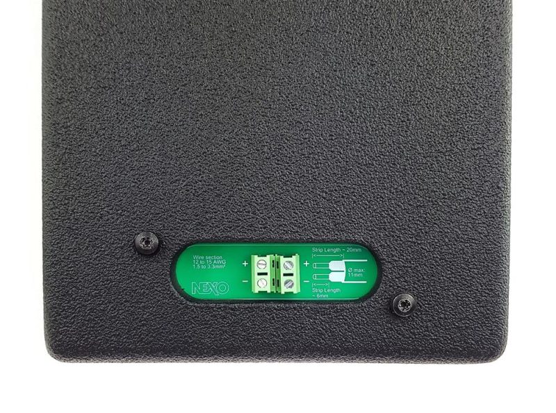 Mặt sau của loa NEXO ePS8 được bố trí 02 cổng kết nối Socket In/Out, được bảo vệ bởi tấm panel IP giúp cho các điểm kết nối tránh được mọi tác nhân gây hại bên ngoài và giúp cố định dây loa chắc chắn hơn.
